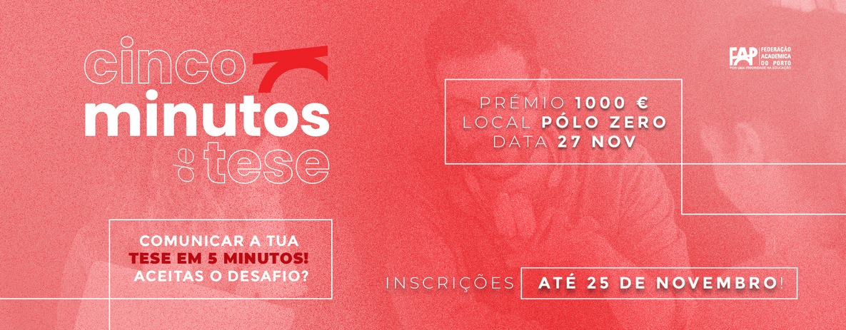 O “5 minutos de tese na Academia do Porto”, organizado pela Federação Académica do Porto, está de volta para a competição sobre a ciência e educação. Através deste concurso, os estudantes de mestrado ou em doutoramento são desafiados a explicar a importância e o impacto da sua investigação a um público não especializado, enquanto promovem a cultura científica e fomentam a interdisciplinaridade e conhecimento na Academia do Porto.